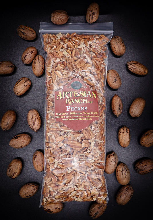 Our pecan program consists of managing and harvesting 5000 native pecan trees. These tasty treats are sold bulk by the truckload or can be ordered directly from the ranch. We offer fancy shelled pecans in halves and pieces in nice gift packages.