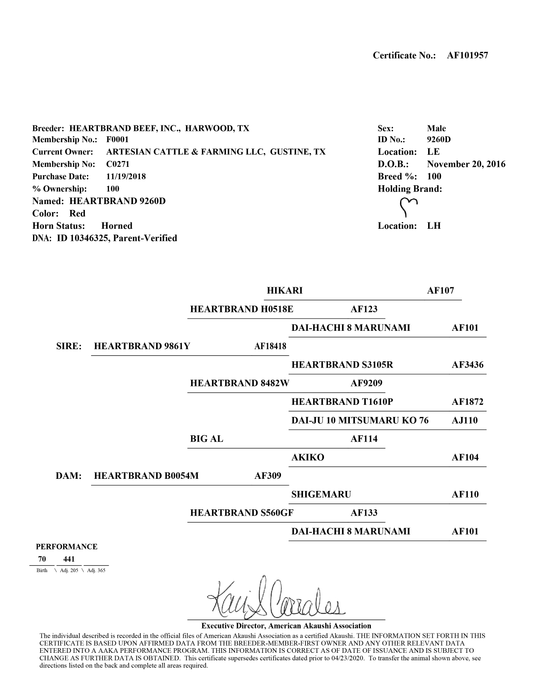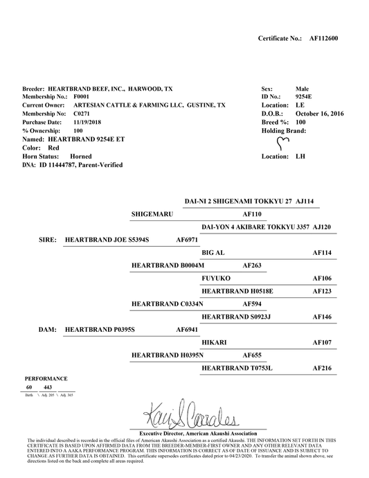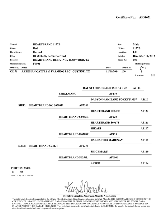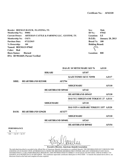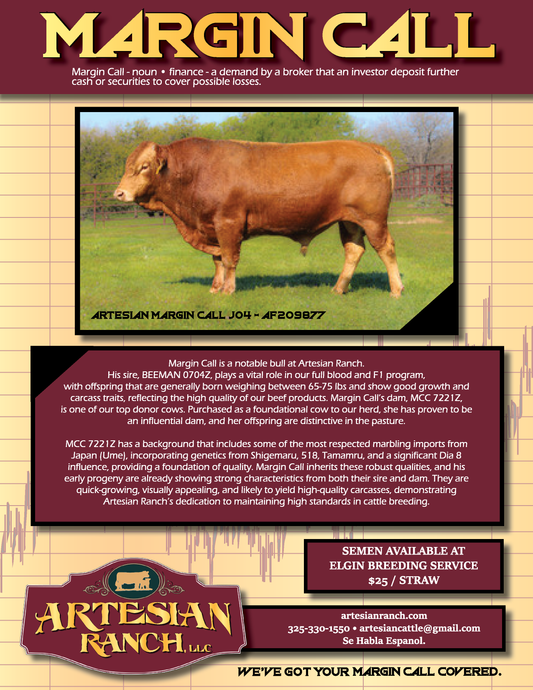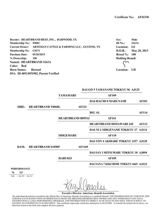 Artesian Ranch operates with a roster of more than 20 Full-Blood 100% Akaushi herd sires. These bulls have been strategically selected and bred to produce high-marbling, structurally-correct, functional offspring. Our herd sires range in age from 18-months-old to 10-plus-years-old. While our program is beef carcass-driven, we know longevity and maternal merit are essential to an efficient, productive operation. Herd sires on Artesian are selected with those traits in mind. Take a look at our semen offerings. You'll notice genetics like Shigemaru, Hikari, Tamamaru, Ume, Big Al, 0518E and Akiko. Consider Artesian genetics and find the sire that will bring your herd to the next level!